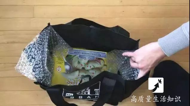將氣泡膜放在購物袋的下面,周圍留出一些多余的氣泡膜,便于包裹,簡單的保溫袋就制作完成了,非常不錯喲。。